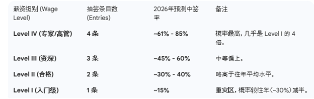 2026 年最大的变革是引入了基于劳工部(DOL)四个薪资级别的加权分配。这意味着你的薪资级别(Wage Level)越高,你在抽签池中的“入场券”就越多。